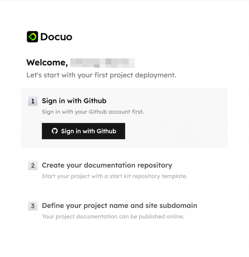 1. Authorize Github We use Github as your docs repository source. All your docs will be stored and managed on your Github.