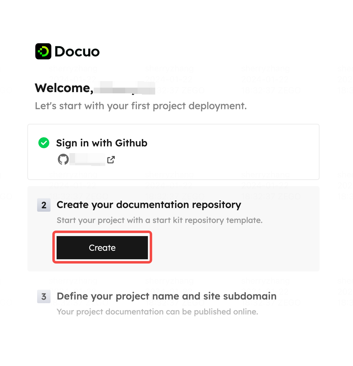 1. Clone template repository to your Github On the next step, you'll create your first repository for your project. We've prepared template repository for you. This will help you get started faster and edit content you want to publish with ease. Hit "Create", Docuo public template repository will be cloned to your own Github, which you can find in your git repository list. After successfully cloning the template repository, we also prepare updating guide for you.